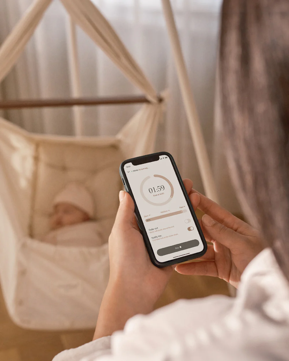 Designed to support your family’s everyday sleep routines by providing quiet, gentle bouncing for your cradle or baby hammock, paired with simple app control.